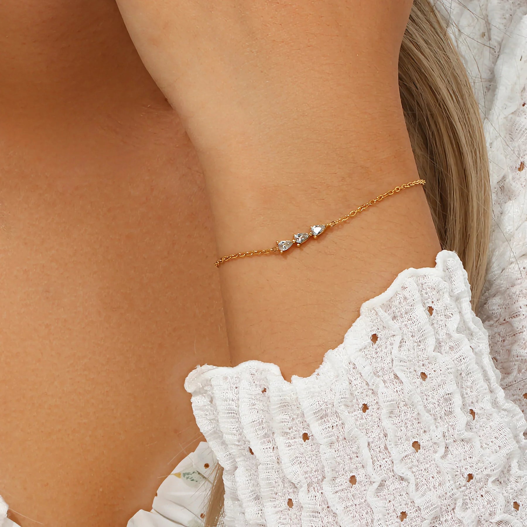 Unveil the elegance of the Alana Diamond Bracelet, a bracelet that draws inspiration from the Alana Diamond Necklace. Crafted from waterproof 18K Gold, this bracelet features a graceful arrangement of teardrop-shaped Diamond Simulants, evoking enduring charm and sophistication.