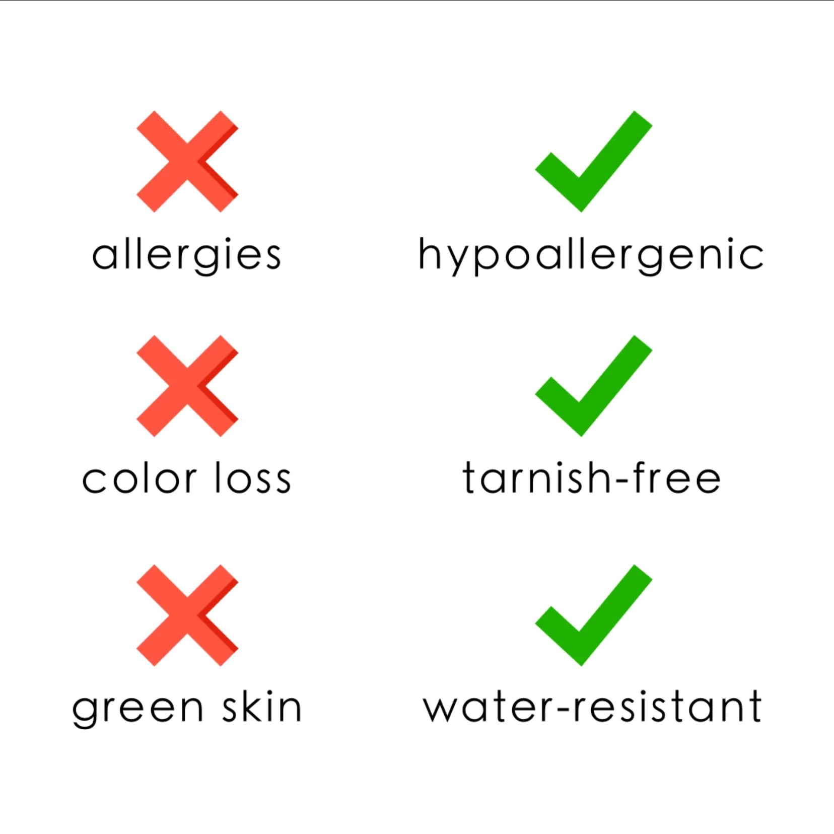 Gentle on Your Skin: Auvéya Jewelry's PVD Gold is hypoallergenic, ensuring it won’t turn your fingers green a common issue with other gold jewelry. We prioritize your comfort and style.