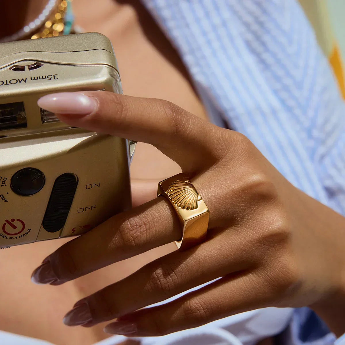 Markante Winkel treffen in AVARIAs Carlotta auf Strandcharme. Mit seiner scharfen geometrischen Silhouette, gekrönt von einer geformten Muschel, verwandelt dieser Statement-Ring die Inspiration des Ozeans in einen kraftvollen Move. Ein Ring, der architektonisch und doch organisch wirkt und jedem Look das gewisse Etwas verleiht.