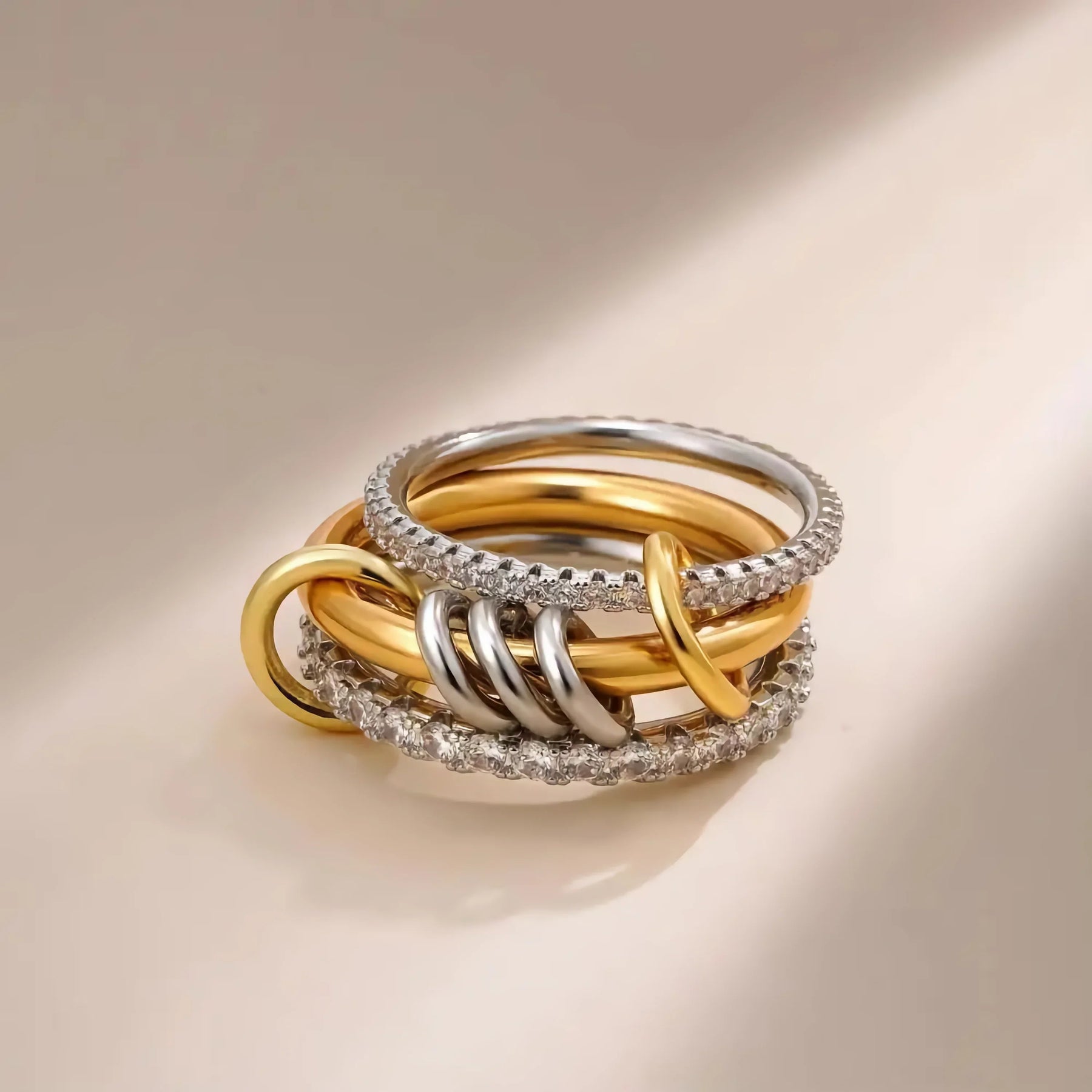 Avarias Cosette besticht durch strahlende Pavé-Diamanten auf Gold- und Silberbändern. Das gestapelte Design bietet sowohl Dimension als auch lichtreflektierende Brillanz in einem schlichten Ring.