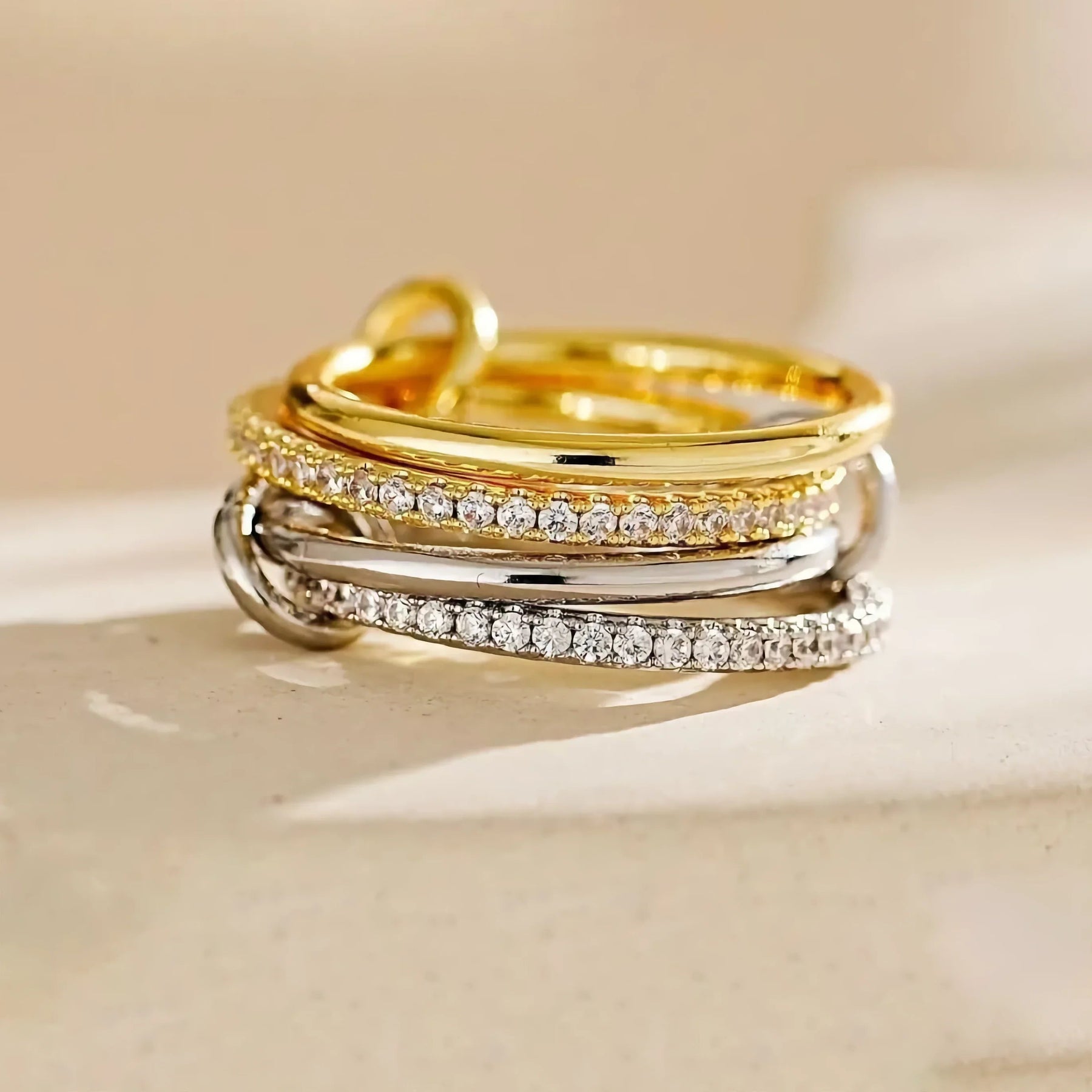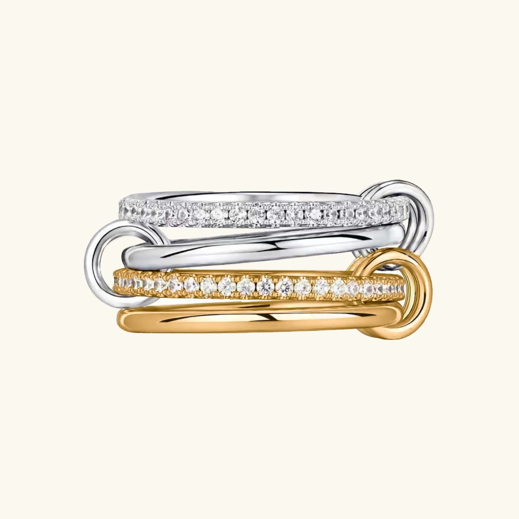 Avarias Ivy sorgt mit gestapelten Gold- und Silberbändern, akzentuiert durch Pavé-Diamanten, für Ausgewogenheit und Brillanz. Es ist auffällig genug, um allein zu stehen, und doch raffiniert genug, um mit anderen Favoriten kombiniert zu werden.