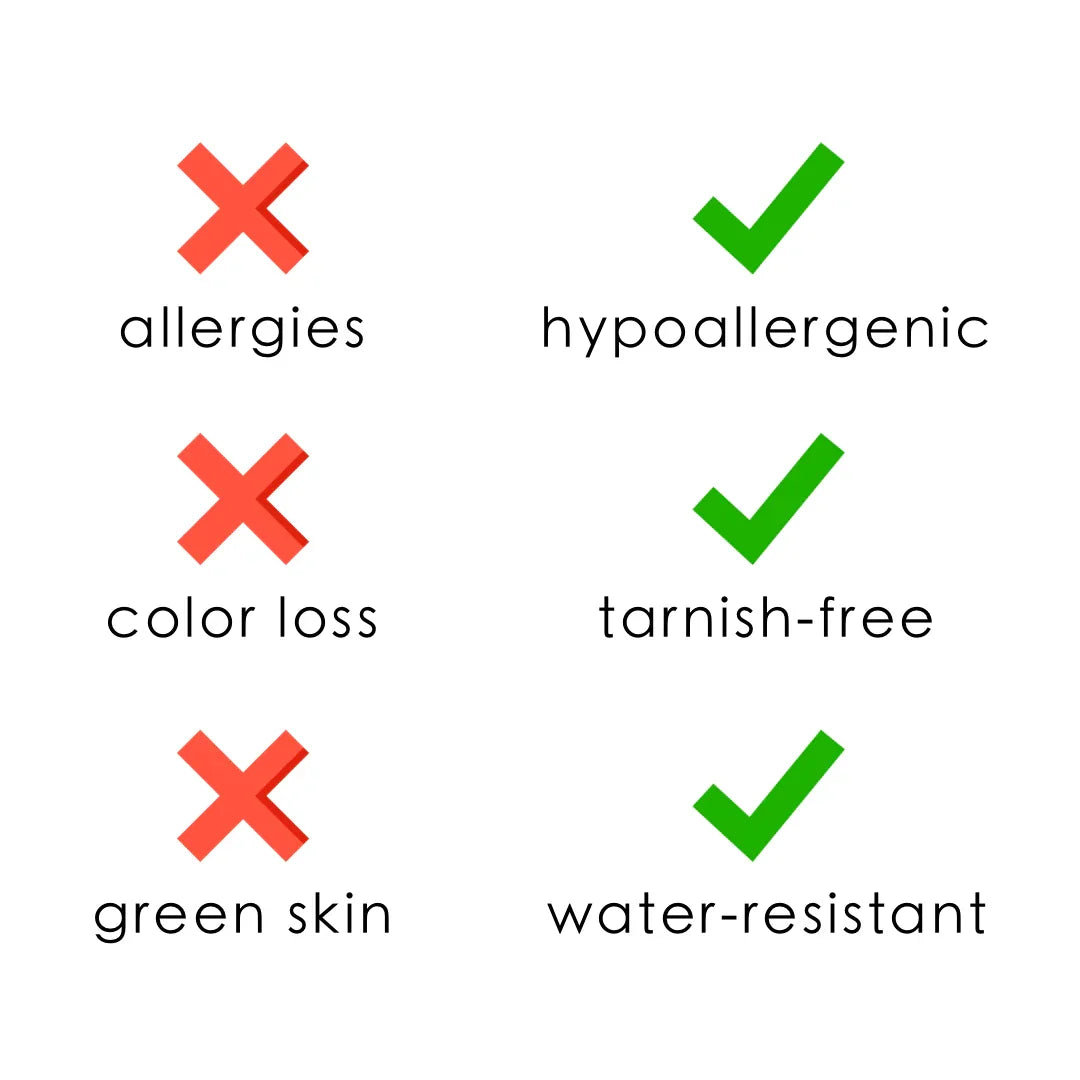 Wir fertigen unseren Schmuck aus bestem Edelstahl und beschichten ihn mit 18 Karat Gold mithilfe einer coolen Technik namens PVD (Physical Vapor Deposition). Dies ist eine neue und bessere Beschichtungsmethode, die die Goldschicht superdick, umweltfreundlich und stark macht.