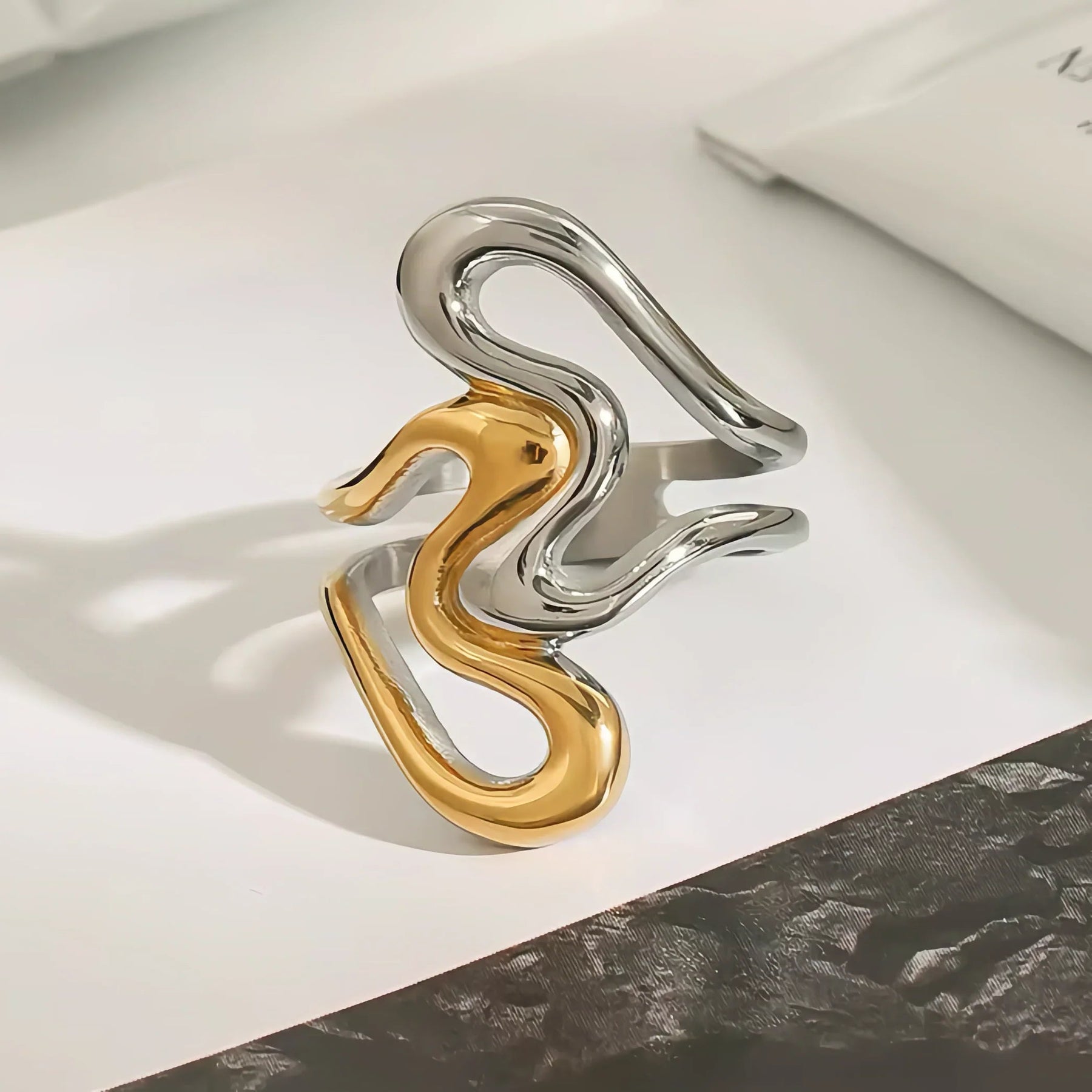 Dare to be different. Avaria's Corina is for those who like their jewelry with a side of personality. Bold, unexpected, and undeniably chic, this abstract gold ring is a piece as unique as you are. Available in both Gold and Two Tone. Waterproof, worry-free, and hypoallergenic, it's ready for anything.