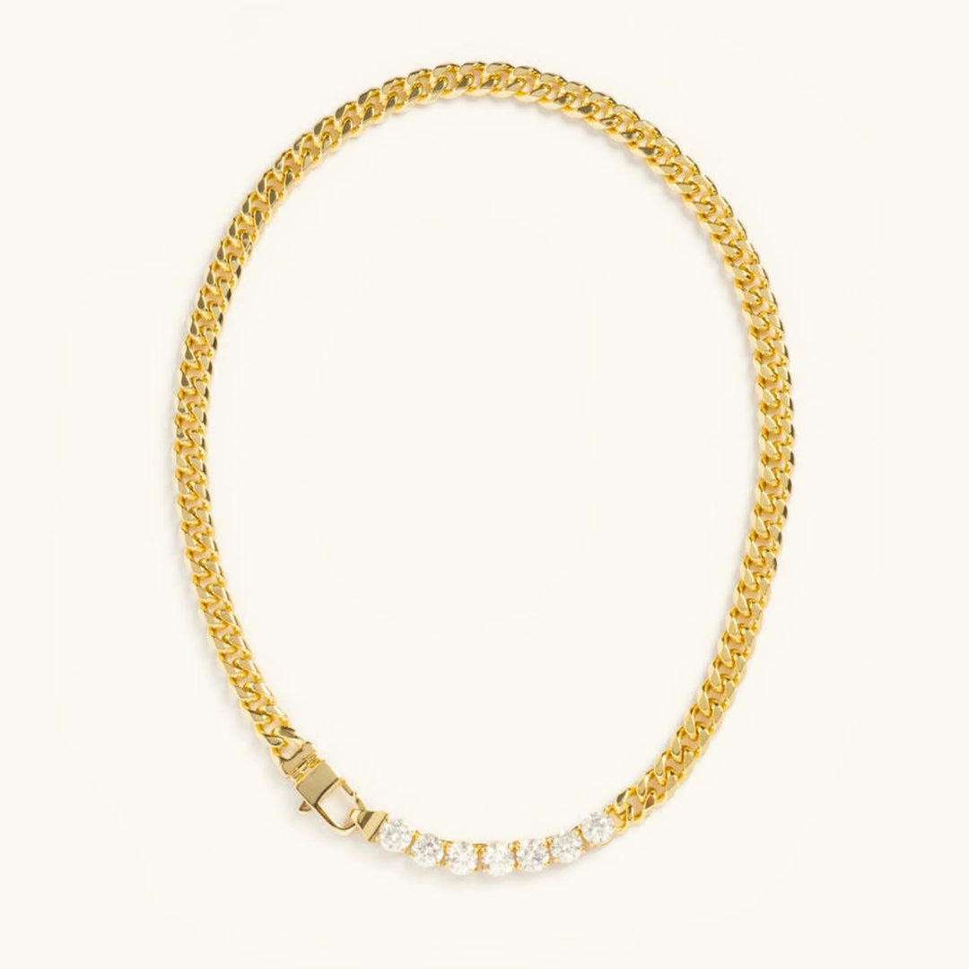 Le collier Maelle d'Avaria allie des maillons en or structurés à une ligne de diamants éclatants. Il en résulte un collier à la fois contemporain et classique, conçu pour un look décontracté qui s'accorde avec toutes vos tenues.