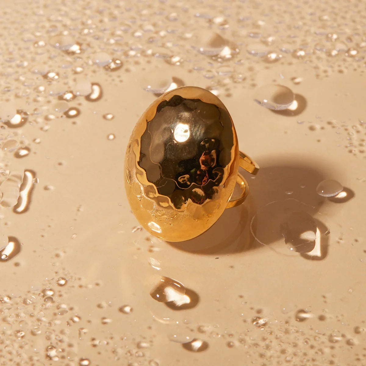 Der Thora Goldring zeigt die Schönheit handwerklicher Handwerkskunst. Er ist aus hypoallergenem 18-karätigem Gold gefertigt, seine klobige Kuppelsilhouette besticht durch eine strukturierte, gehämmerte Oberfläche und bietet eine Mischung aus Stärke und purer Eleganz.